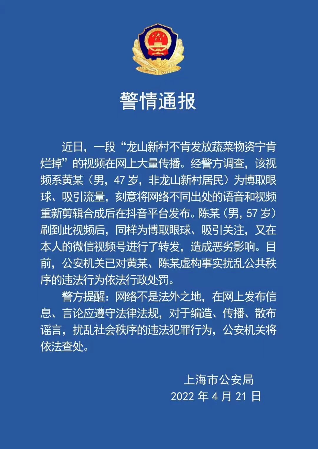 近日,一段“龙山新村不肯发放蔬菜物资宁肯烂掉”的视频在网上大量传播。经警方调查,该视频系黄某(男,47岁,非龙山新村居民)为博取眼球、吸引流量,刻意将网络不同出处的语音和视频重新剪辑合成后在抖音平台发布。陈某(男,57岁)刷到此视频后,同样为博取眼球、吸引关注,又在本人的微信视频号进行了转发,造成恶劣影响。目前,公安机关已对黄某、陈某虚构事实扰乱公共秩序的违法行为依法行政处罚。