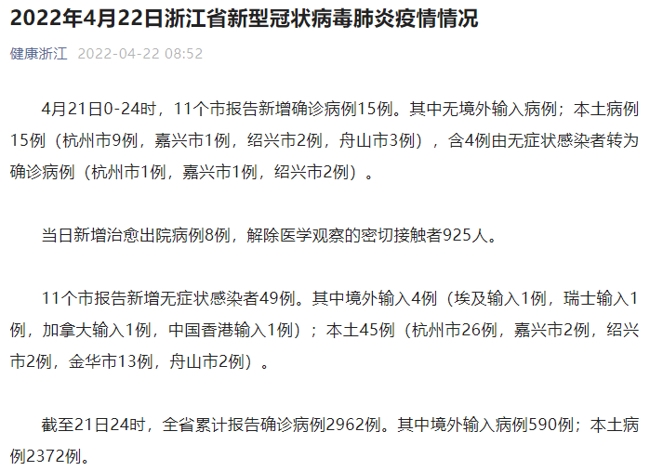4月21日0-24时,11个市报告新增确诊病例15例。其中无境外输入病例;本土病例15例(杭州市9例,嘉兴市1例,绍兴市2例,舟山市3例),含4例由无症状感染者转为确诊病例(杭州市1例,嘉兴市1例,绍兴市2例)。