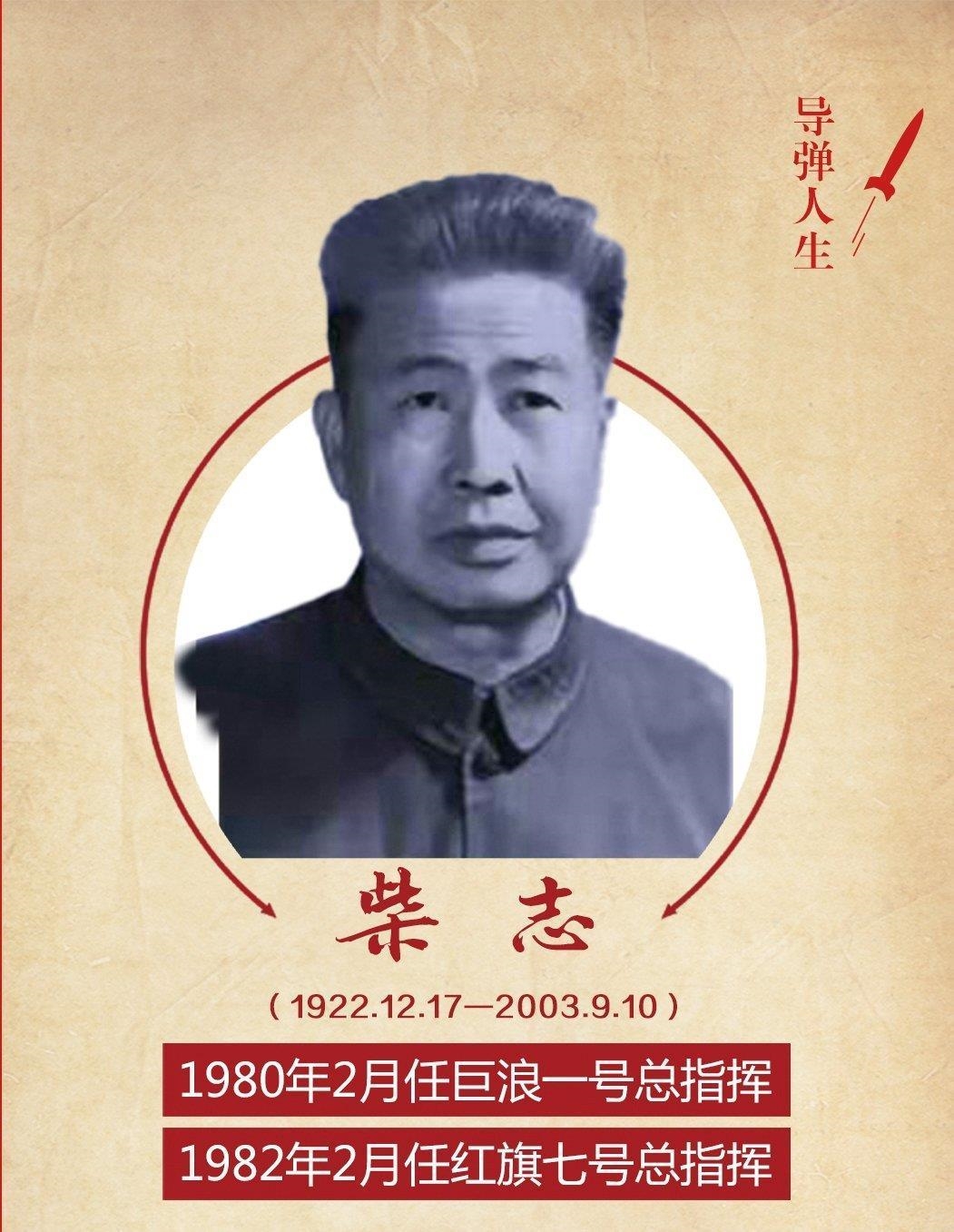 巨浪一号、红旗七号总指挥柴志(1922.12.17-2003.9.10),1980年2月任巨浪一号总指挥,1982年2月任红旗七号总指挥。他曾参与领导“1059”控制系统和地面设备仿制工作、东风二号控制系统自行设计工作、“543”仿制工作、红旗二号研制、巨浪一号、东风二十一号的研制。并任型号总指挥。组织领导红旗七号的研制,担任行政总指挥。为我国国防工业作出突出贡献。
