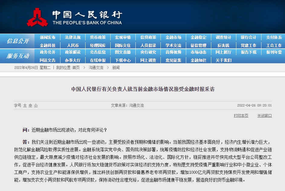 据中国人民银行网站消息,中国人民银行有关负责人就当前金融市场情况接受金融时报采访。