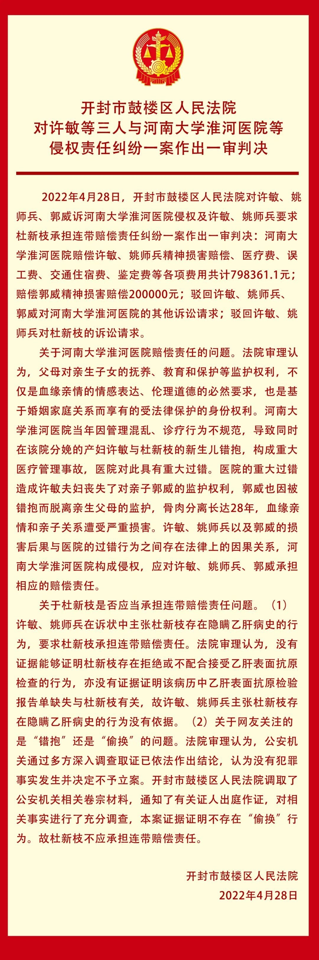“错换人生28年案”一审宣判,姚策养母获赔79万元
