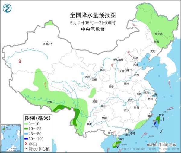 明后天,南方大部降水基本停歇。预计,明天,西藏东南部、云南西北部、海南岛、台湾岛等地的部分地区有中到大雨,其中台湾岛南部等地局地暴雨(50~60毫米)。