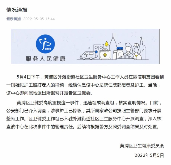 5月4日下午,黄浦区外滩街道社区卫生服务中心工作人员在微信朋友圈看到一则疑似护工殴打老人的视频,经确认是该中心总院住院部患者及护工。当晚,该中心即向属地派出所报警并报告区卫健委。