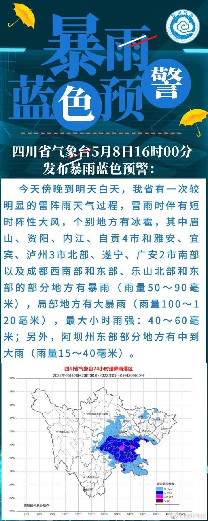 四川省气象台5月8日16时00分发布暴雨蓝色预警: