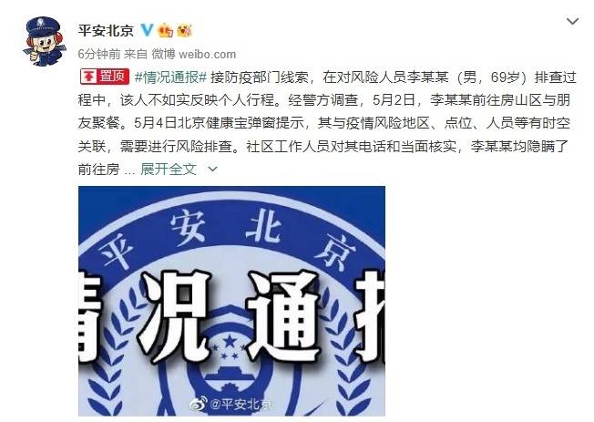 据“平安北京朝阳”微信公众号消息,接防疫部门线索,在对风险人员李某某(男,69岁)排查过程中,该人不如实反映个人行程。经警方调查,5月2日,李某某前往房山区与朋友聚餐。5月4日北京健康宝弹窗提示,其与疫情风险地区、点位、人员等有时空关联,需要进行风险排查。社区工作人员对其电话和当面核实,李某某均隐瞒了前往房山的行程。5月5日,其还前往市场多个摊位购物。该人隐瞒行程的行为,导致相关风险人员和点位未被及时纳入有效管控。5月6日,李某某及其1名亲属确诊。目前,李某某涉及的10余个风险点位被封控,17名密接人员被隔离。5月8日,朝阳公安分局依法对李某某刑事立案调查。