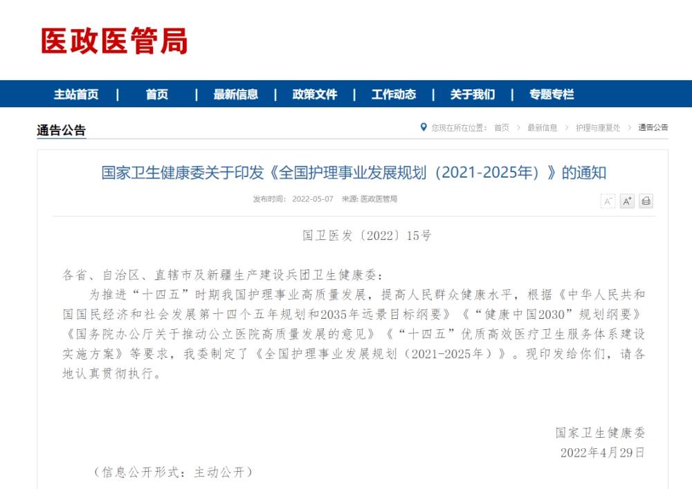 此外,规划明确主要任务:一是完善护理服务体系,优化护理资源布局,增加护理服务供给;二是加强护士队伍建设;三是推动护理高质量发展,持续深化优质护理;四是补齐护理短板弱项,加快发展老年医疗护理,提升基层护理服务能力,加快发展安宁疗护;五是加强护理信息化建设,充分借助云计算、大数据、物联网、区块链和移动互联网等信息化技术,结合发展智慧医院和“互联网+医疗健康”等要求,着力加强护理信息化建设;六是推动中医护理发展,促进中医护理进一步向基层和家庭拓展,向老年护理、慢病护理领域延伸;七是加强护理交流合作。