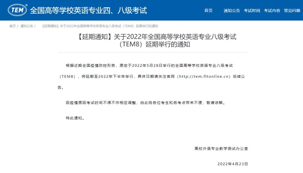 5月9日,高校外语专业教学测试办公室发布通知,根据近期全国疫情防控形势,原定于2022年6月18日举行的全国高等学校英语专业四级考试(TEM4)延期举行,具体考试时间及安排将另行通知。