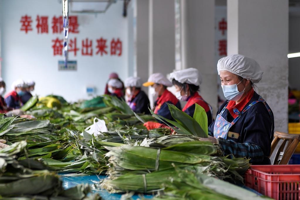 在瑞塔铺镇桑瑞家园小区,一家粽叶企业的车间里机器隆隆作响,飘满粽叶清香。距离端午节不到一个月,工人们正加班加点赶制订单。