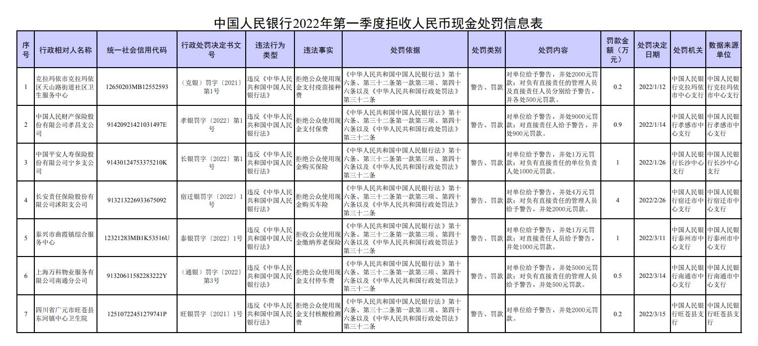 2022年第一季度,人民银行依法对7家拒收现金的单位及相关责任人作出经济处罚,处罚金额从2000元至4万元人民币不等。被处罚的单位包括便民服务中心等公共服务机构以及停车场、保险公司、医疗机构等。