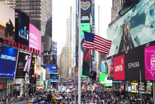 这是5月17日在美国纽约时报广场拍摄的美国国旗。新华社记者王迎摄