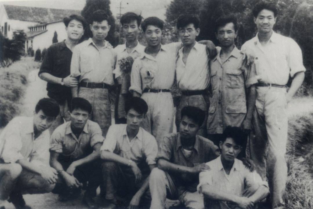 △袁隆平(后排左四)被拟招为空军飞行员后,同学们当时欢送合影。
