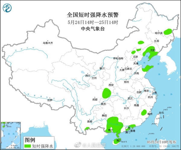 中央气象台24日10时发布强对流天气蓝色预警:预计24日14时至25日14时,内蒙古东南部、黑龙江东部、吉林中部、辽宁中西部、山西东北部、河北、北京、天津、山东北部等地的部分地区将有8-10级雷暴大风或冰雹天气;内蒙古东南部、黑龙江东南部、辽宁中东部、陕西南部、河北北部、北京东北部、山东东部、福建中部、四川盆地东北部、重庆西北部、广西、广东南部、海南岛等地的部分地区将有短时强降水天气,小时雨量20-40毫米,局地可达50毫米以上。
