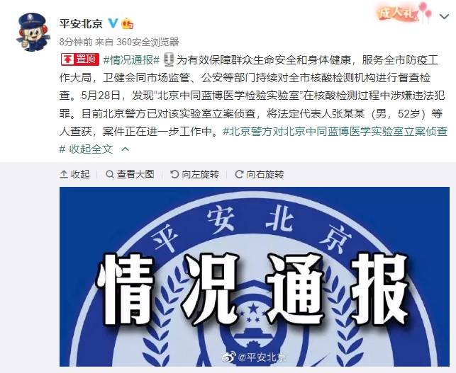 为有效保障群众生命安全和身体健康,服务全市防疫工作大局,卫健会同市场监管、公安等部门持续对全市核酸检测机构进行督查检查。5月28日,发现“北京中同蓝博医学检验实验室”在核酸检测过程中涉嫌违法犯罪。目前北京警方已对该实验室立案侦查,将法定代表人张某某(男,52岁)等人查获,案件正在进一步工作中。