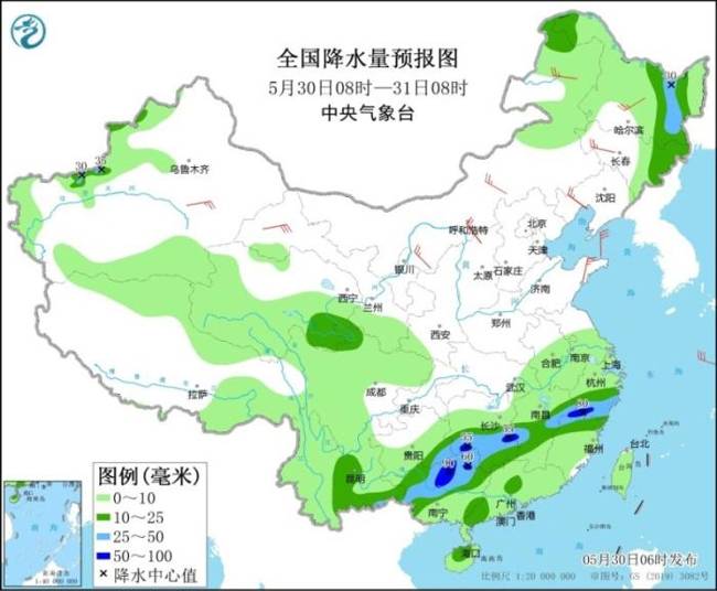 5月30日08时至31日08时,新疆西部、青藏高原北部和东部、内蒙古东北部、黑龙江、吉林东部、江南大部、云南、贵州中南部、华南、苏皖中南部等地的部分地区有小到中雨,其中,浙江南部、福建北部、江西中部、湖南中南部、广西北部以及黑龙江东部、新疆南疆西部等地的部分地区有大雨,局地有暴雨(50~90毫米)。内蒙古中东部、东北地区、山西北部、河北北部等地的部分地区有4~6级风。黄海北部和东海北部海域有4~6级、阵风7级的偏西风,东海南部和南海西南部海域有4~6级、阵风7级的西南风。