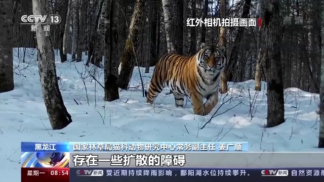 国家林草局猫科动物研究中心常务副主任 姜广顺:通过我们的监测,发现“完达山1号”逐步向虎豹公园腹地进行扩散,我们也发现存在一些扩散的障碍。通过对“完达山1号”跟踪路径的分析,我们可以找到如何来疏通虎豹公园内部的虎和外部的虎进行交流的通道。
