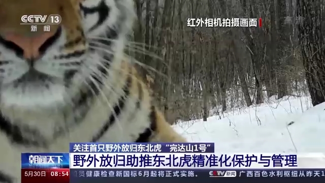 2021年4月23日,3岁雄性东北虎“完达山1号”误闯入黑龙江省密山市的一个村庄。在国家林草局的指导下,黑龙江省林草部门组织有关专家及科研人员对其进行了现场救护,大概一个月后放归自然。“完达山1号”放归后,通过局部区域的红外相机及东北虎豹国家公园监测体系,共拍摄到“完达山1号”10余次。
