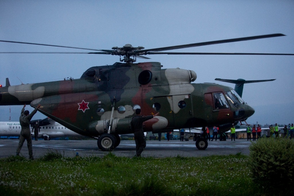 5月30日,在尼泊尔加德满都的一座机场,救援直升机运送遇难者遗体。新华社发(苏拉韦·什雷斯塔摄)