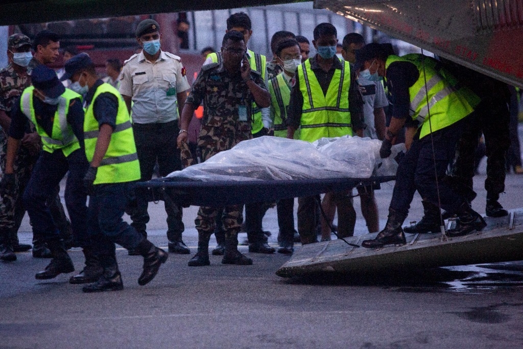 5月30日,在尼泊尔加德满都的一座机场,救援人员运送遇难者遗体。新华社发(苏拉韦·什雷斯塔摄)