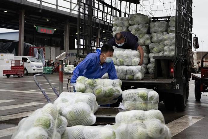 2022年4月2日,工作人员在海口市菜篮子江楠农产品批发市场搬运蔬菜。 新华社记者 胡智轩 摄