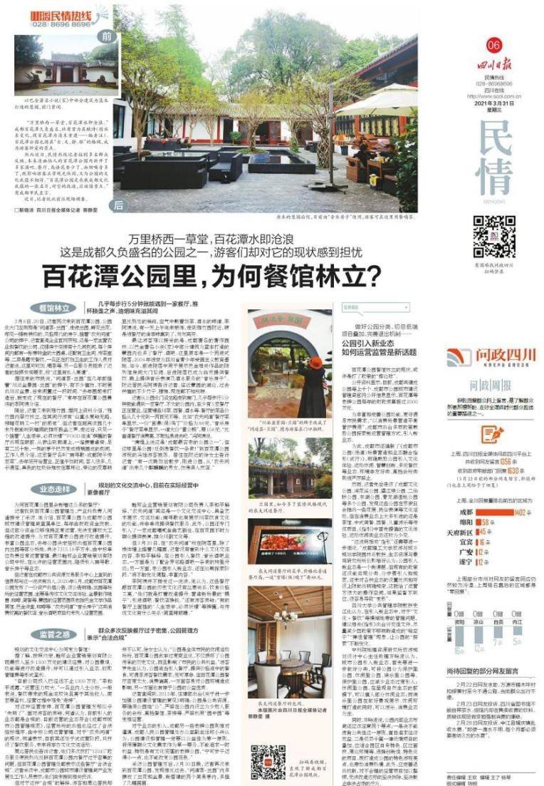 2021年,四川日报全媒体认真打造“民情”“问政”“网络辟谣”等网上群众服务平台,处理信息近十万条。“问政四川”网络理政平台被纳入省政府办公厅走好网上群众路线为民服务办实事有关工作,入驻账号达3536家、注册用户达158万余人及单位,实现21个市州183个县(市、区)全覆盖。民情频道和民情版刊发批评稿件、调查报道500多篇,“川观辟谣”平台发稿超过70篇,《民情|还能不能搞年猪宴?农村屠宰网点亟待补缺》《百花潭公园里,为何餐馆林立》等一批高质量监督报道,引起强烈社会反响,促进相关问题解决。