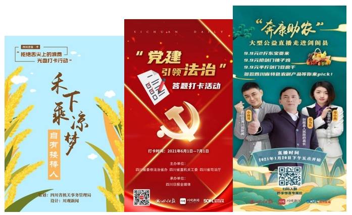 (四川在线“第二季‘拒绝舌尖上的浪费光盘打卡行动’”“党建引领法治答题打卡活动”“奔康助农”海报)