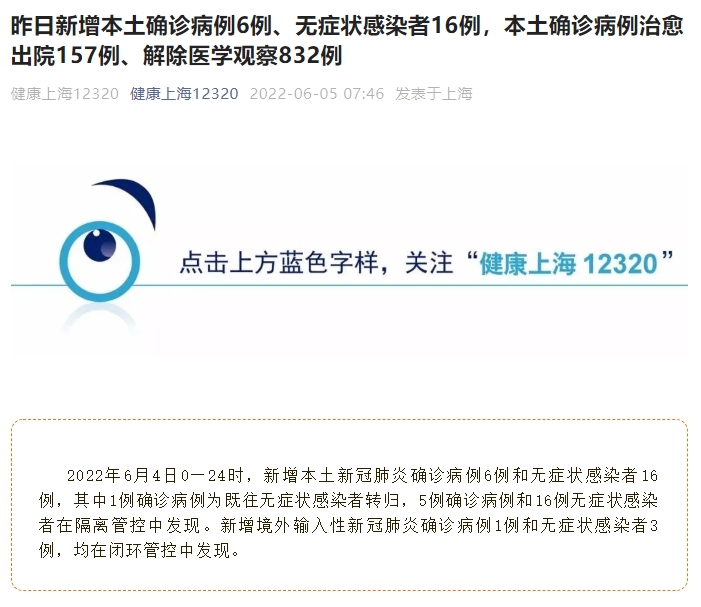 2022年6月4日0—24时,新增本土新冠肺炎确诊病例6例,含1例由既往无症状感染者转为确诊病例。新增治愈出院157例。