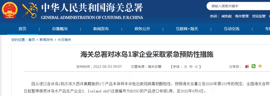 海关总署对冰岛1家企业采取紧急预防性措施