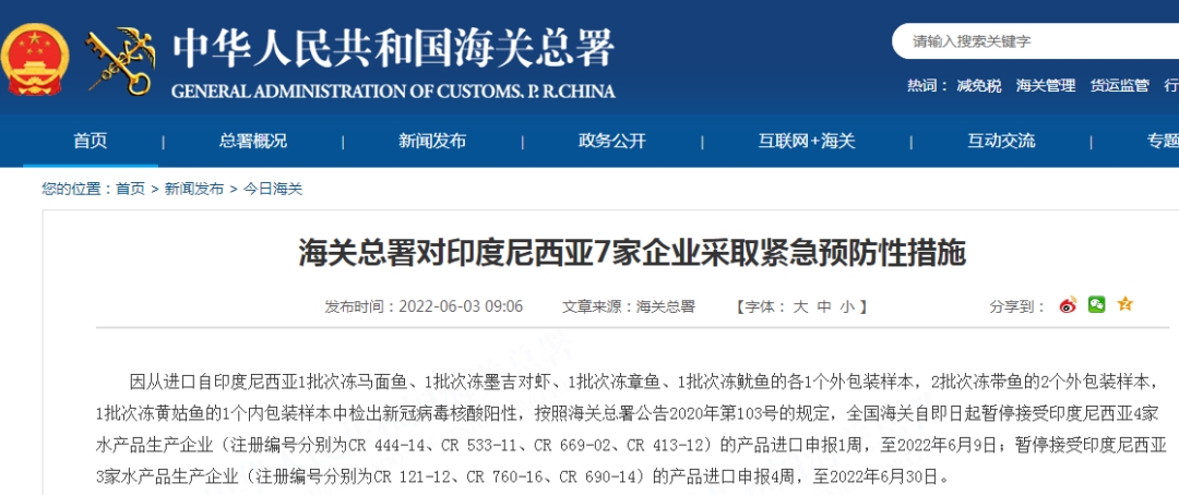 因从进口自印度尼西亚1批次冻马面鱼、1批次冻墨吉对虾、1批次冻章鱼、1批次冻鱿鱼的各1个外包装样本,2批次冻带鱼的2个外包装样本,1批次冻黄姑鱼的1个内包装样本中检出新冠病毒核酸阳性,按照海关总署公告2020年第103号的规定,全国海关自即日起暂停接受印度尼西亚4家水产品生产企业(注册编号分别为CR 444-14、CR 533-11、CR 669-02、CR 413-12)的产品进口申报1周,至2022年6月9日;暂停接受印度尼西亚3家水产品生产企业(注册编号分别为CR 121-12、CR 760-16、CR 690-14)的产品进口申报4周,至2022年6月30日。