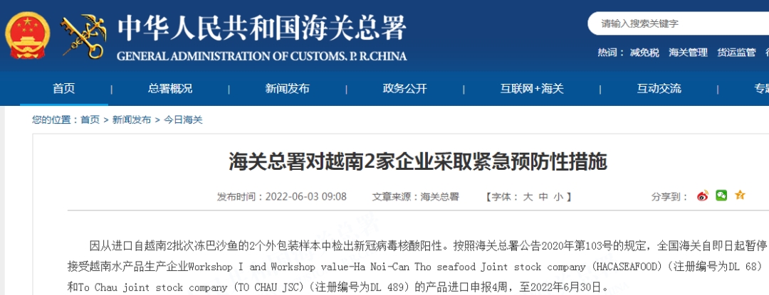 因从进口自越南2批次冻巴沙鱼的2个外包装样本中检出新冠病毒核酸阳性。按照海关总署公告2020年第103号的规定,全国海关自即日起暂停接受越南水产品生产企业Workshop I and Workshop value-Ha Noi-Can Tho seafood Joint stock company (HACASEAFOOD)(注册编号为DL 68)和To Chau joint stock company (TO CHAU JSC)(注册编号为DL 489)的产品进口申报4周,至2022年6月30日。