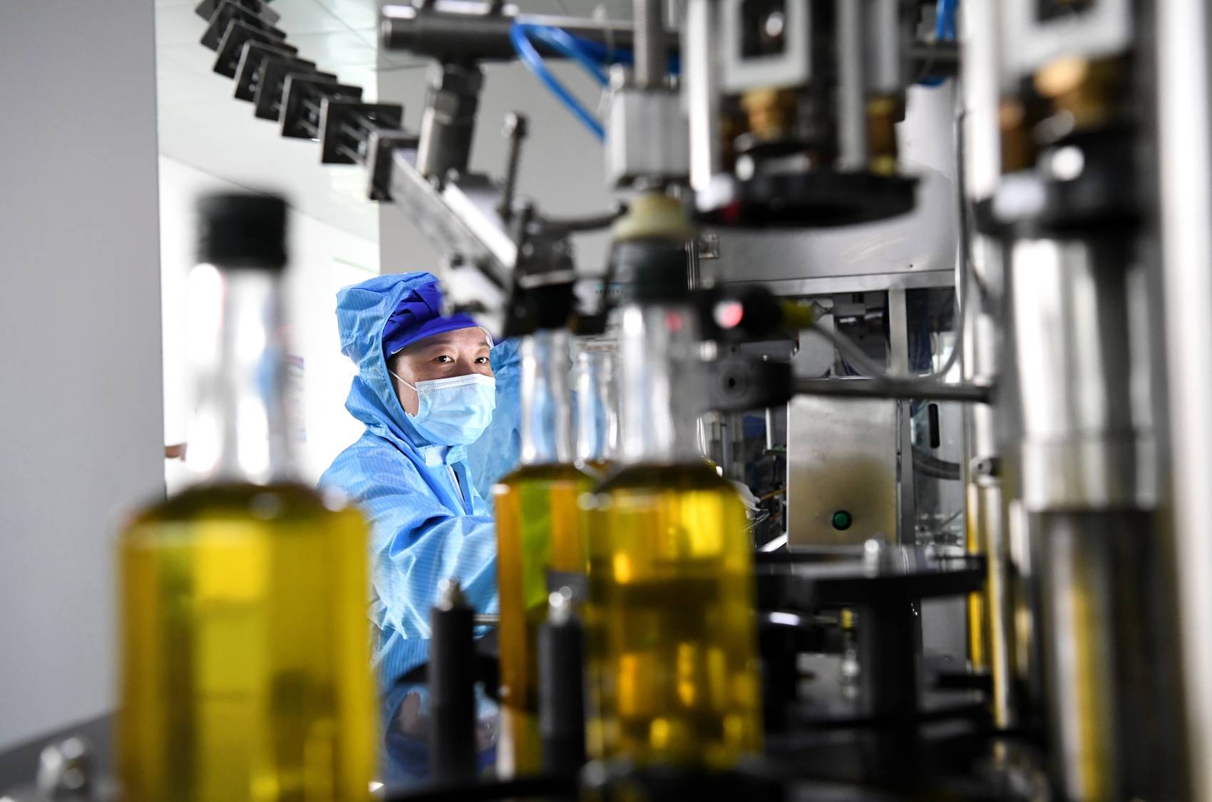 工作人员在河南省光山县一家油茶加工企业的灌装车间作业。新华社记者郝源摄