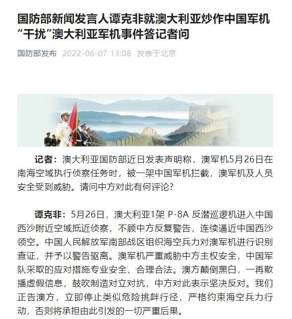 谭克非:5月26日,澳大利亚1架 P-8A 反潜巡逻机进入中国西沙附近空域抵近侦察,不顾中方反复警告,连续逼近中国西沙领空。中国人民解放军南部战区组织海空兵力对澳军机进行识别查证,并予以警告驱离。澳军机严重威胁中方主权安全,中国军队采取的应对措施专业安全、合理合法。澳方颠倒黑白,一再散播虚假信息,鼓吹制造对立对抗,中方对此表示坚决反对。我们正告澳方,立即停止类似危险挑衅行径,严格约束海空兵力行动,否则将承担由此引发的一切严重后果。