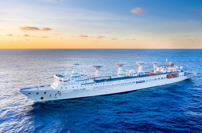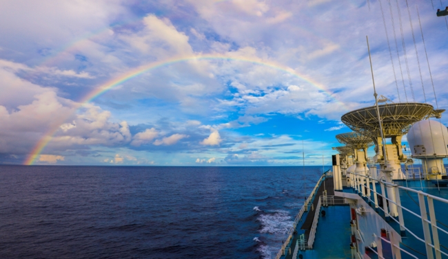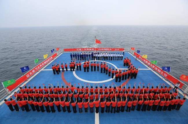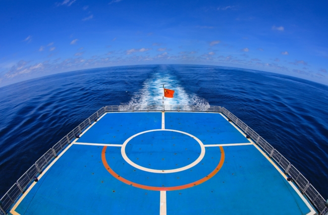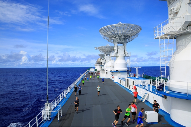 远望号船驰骋在无垠的蔚蓝,海天间犁出一道驶向胜利的灿烂航迹。