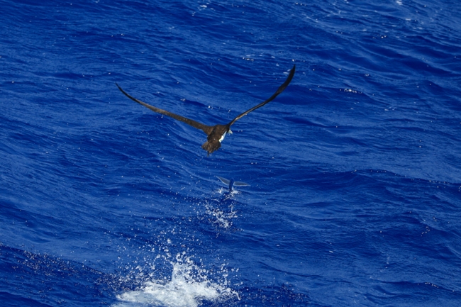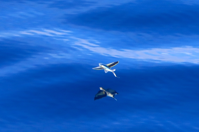 一只飞鱼跃出平静的海面,澄澈的海水倒映出逐梦的模样。