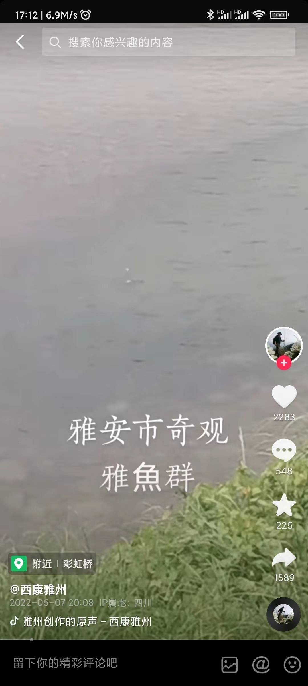 6月1日雅安芦山地震发生后,6月7日在短视频APP抖音上流传一则视频,视频显示雅安市区河边出现大量鱼群聚集,拍摄者及部分网友对这一现象表示从未见过,并留言说:“要地震了”。6月10日,记者从雅安市防震减灾服务中心了解到,得知抖音传播的这一消息后,中心立即派出工作人员对视频中拍摄地以及周边群众进行了调查走访,得出结论为此次市区河边大量鱼群聚集现象应该与6日青衣江大量放鱼有关,不是地震宏观现象。