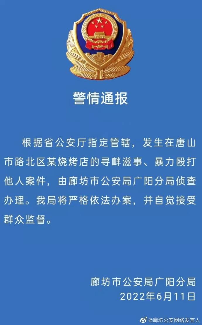 河北省公安厅指定:唐山烧烤店打人案,由廊坊公安局广阳分局侦查办理