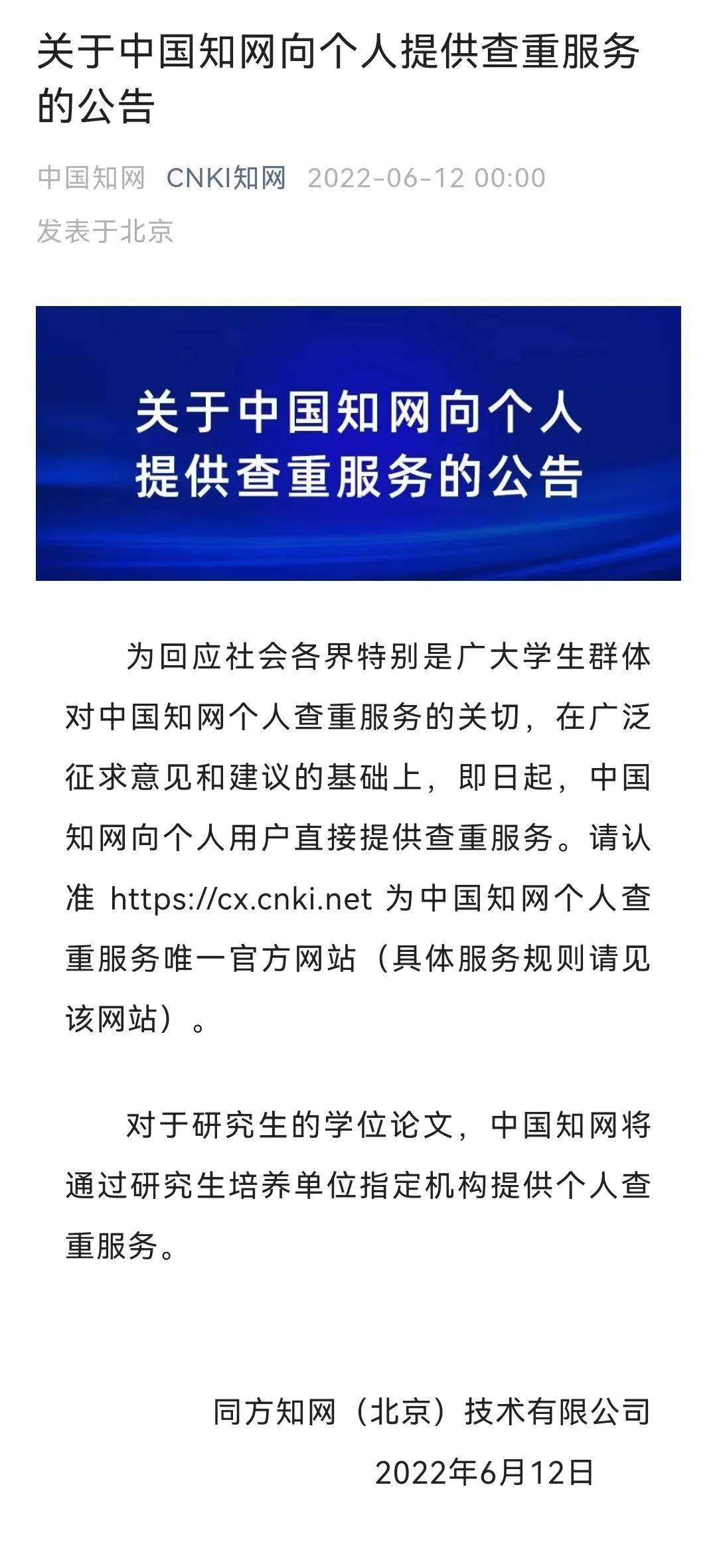 6月12日凌晨,中国知网在其官网微信公众号上发布《关于中国知网向个人提供查重服务的公告》,表示即日起,中国知网向个人用户直接提供查重服务。