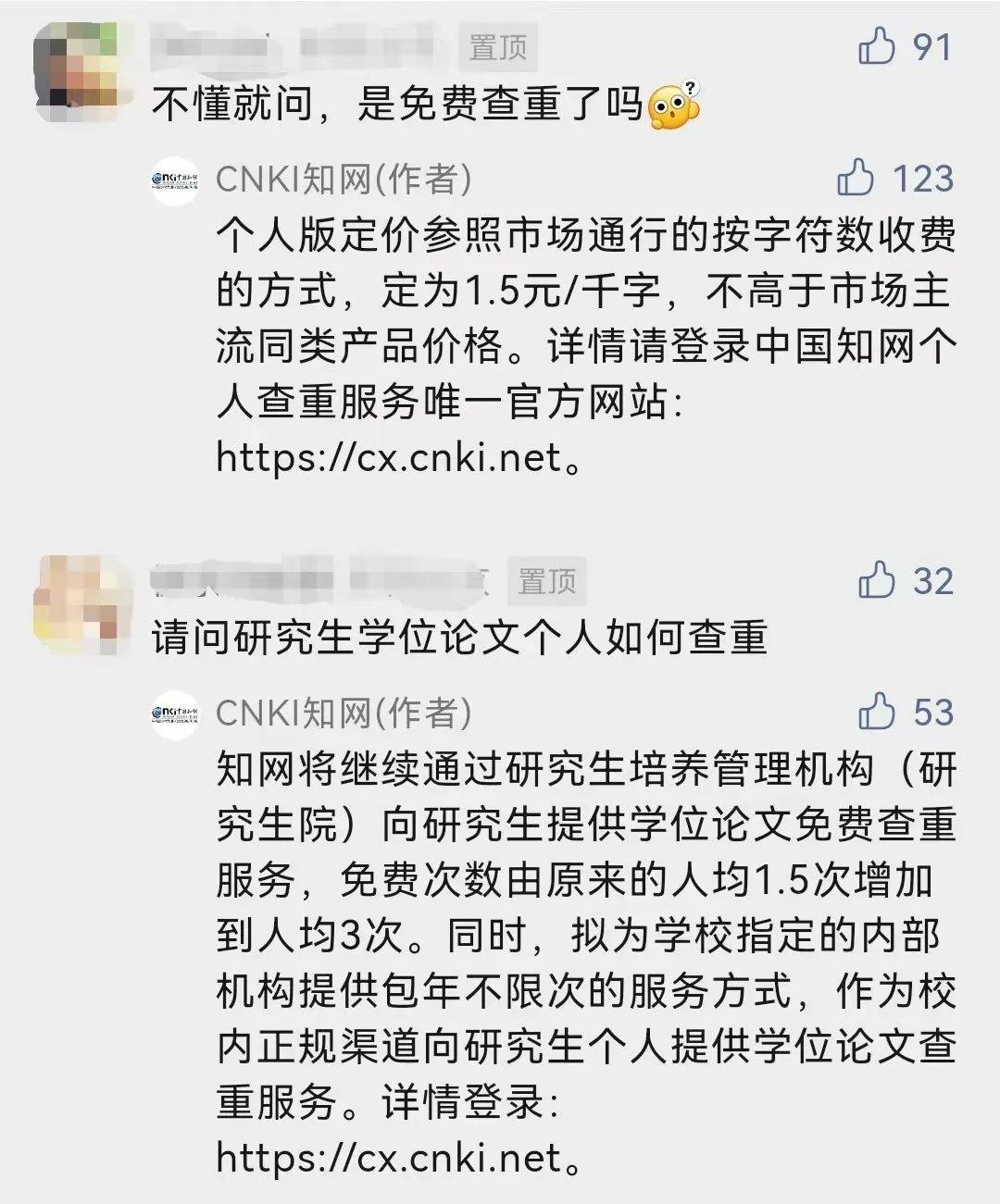此外,知网官方公众号对知网个人查重服务常见问题进行了解答。其中提到,开放个人查重服务的原因是“知网过去只面向机构提供查重服务,忽略了广大个人用户学术规范自检与查新等实际需求,客观上造成了黑市与高价的问题。”