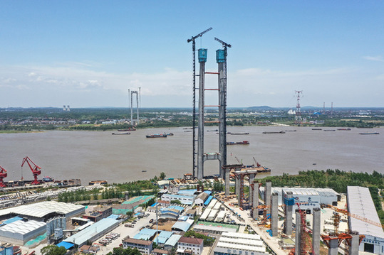 正在建设中的龙潭长江大桥位于南京长江四桥与润扬长江大桥之间,北接扬州仪征市,南接南京市、镇江句容市,双向六车道,设计时速100公里,全长4925米。新华社记者 杨磊 摄
