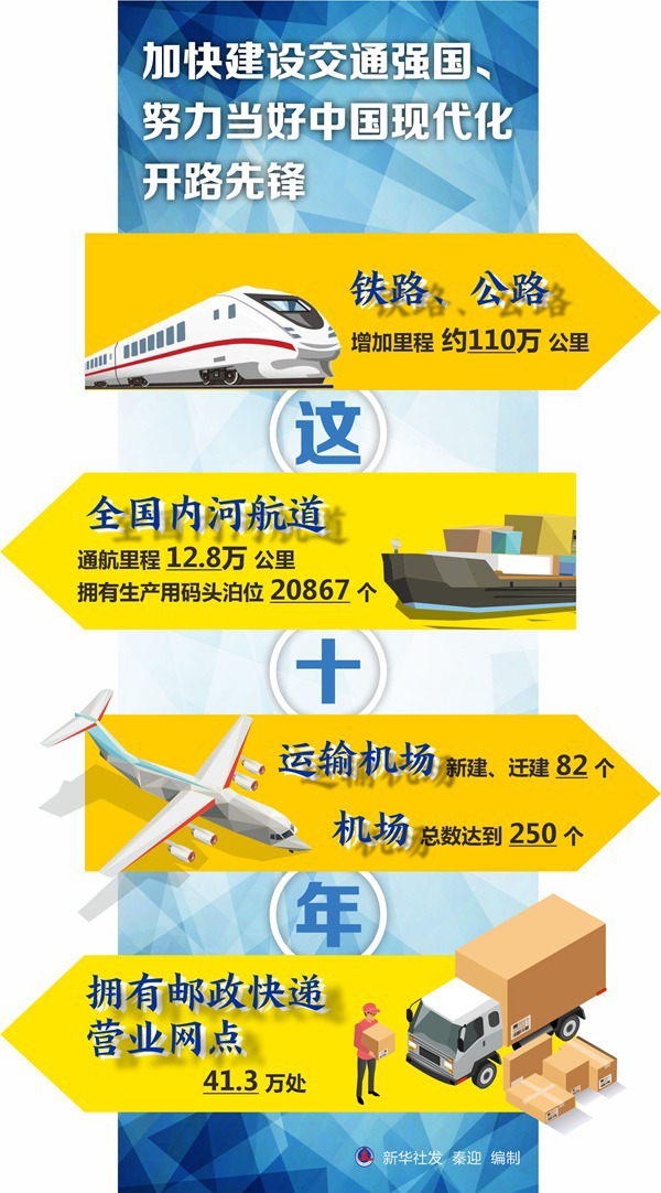建成全球最大的高速铁路网、高速公路网、世界级港口群,航空海运通达全球,铁路、公路、水运、民航客货周转量、港口货物吞吐量、邮政快递业务量等主要指标连续多年位居世界前列,有力服务打赢脱贫攻坚战和乡村振兴战略实施,疫情期间全力保障产业链供应链稳定畅通……