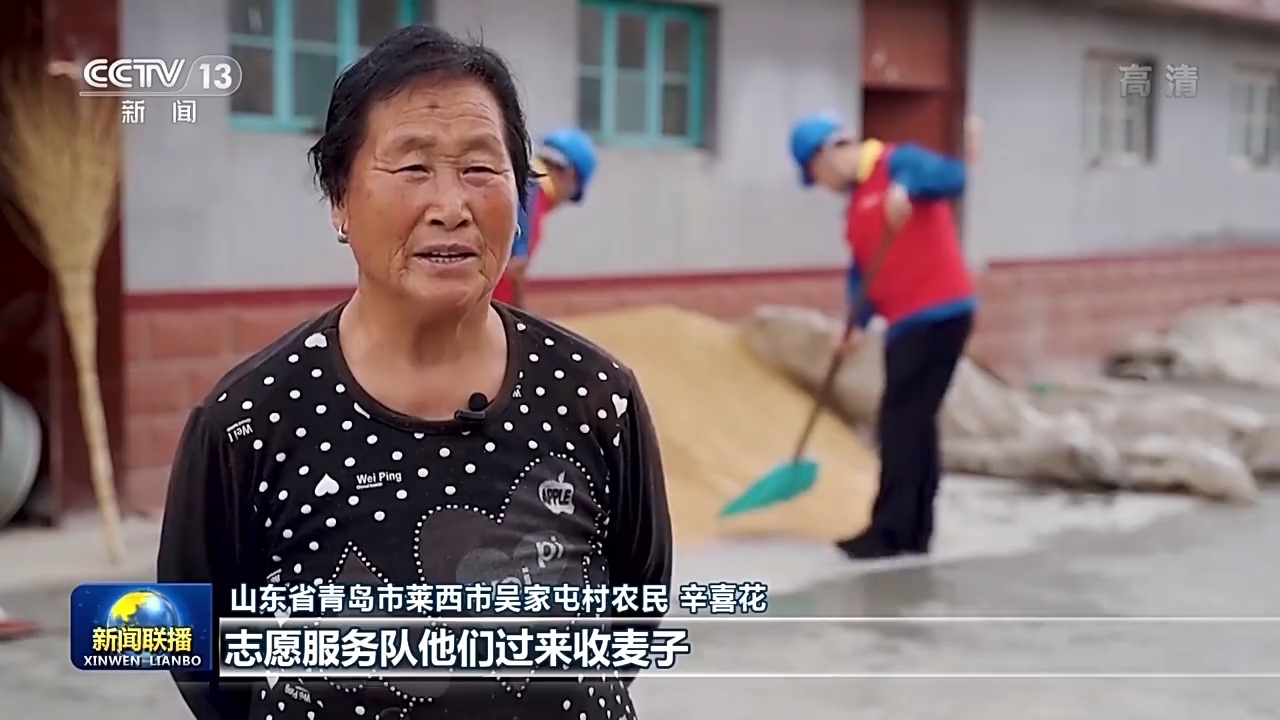 在山东莱西,66万多亩小麦进入集中收获期,当地30多家社会化服务组织和志愿服务队活跃在麦收一线。吴家屯村农民辛喜花的孩子在外打工,在志愿服务队帮助下,她家3亩多小麦不到一小时就收获完成运送到家。