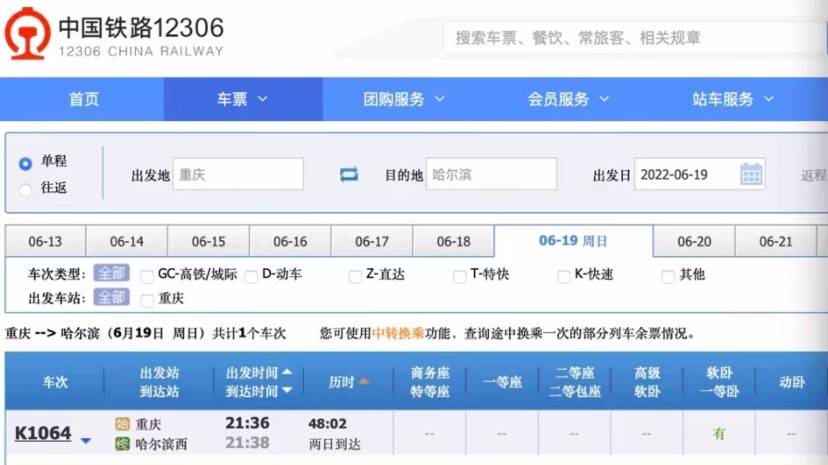 记者查询12306官方显示,调图后,重庆菜园坝火车站已无售票列车。6月19日21:36,从菜园坝火车站发出的最后一趟列车为K1064由重庆开往哈尔滨西。