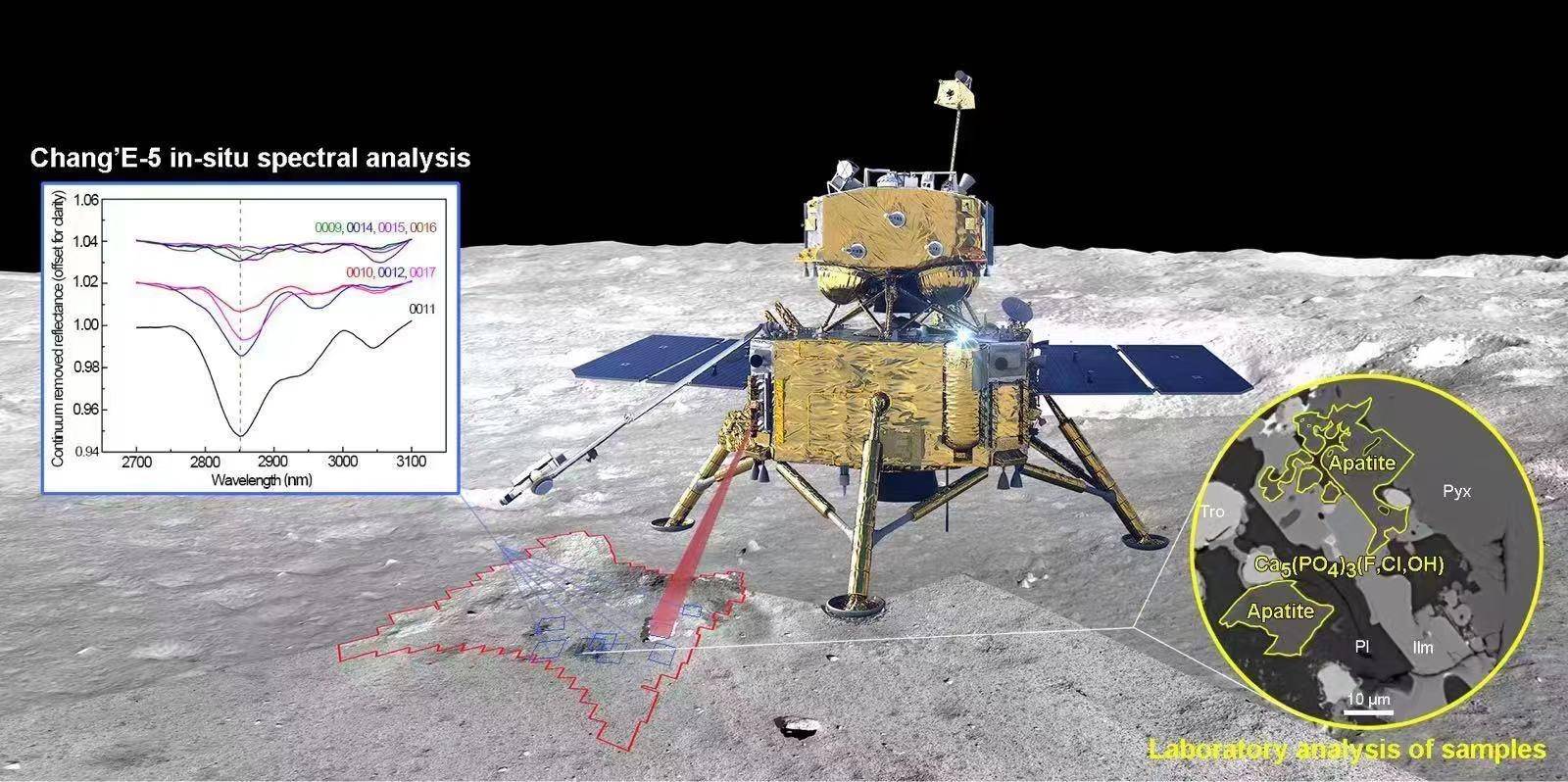 北京时间2022年6月15日,《自然通讯》(Nature Communications)在线发布我国嫦娥五号的一项重要研究成果。中国科学院国家天文台李春来、刘建军研究员和上海技术物理研究所舒嵘研究员领导的团队,与中科院地质地球所、物理所、西安光机所、地球化学所,北京空间飞行器总体设计部、北京航天飞行控制中心、北京空间机电研究所等单位合作,在国际上首次联合月球样品的实验室分析结果和月表就位探测的光谱数据,检验了月球样品中水的有无、形式和多少,回答了嫦娥五号着陆区水的分布特征和来源问题,为遥感探测数据中水的信号解译和估算提供了地面真值。