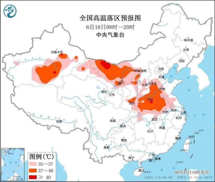 中央气象台6月15日18时发布高温黄色预警:预计,6月16日白天,华北南部、黄淮以及西北地区东部、新疆南疆盆地等地的部分地区将出现35℃以上的高温天气,其中,河北南部、河南大部、山东西部、安徽北部、湖北西北部以及内蒙古西部、宁夏中北部、南疆盆地等地最高气温37至40℃,局地可达40℃以上。
