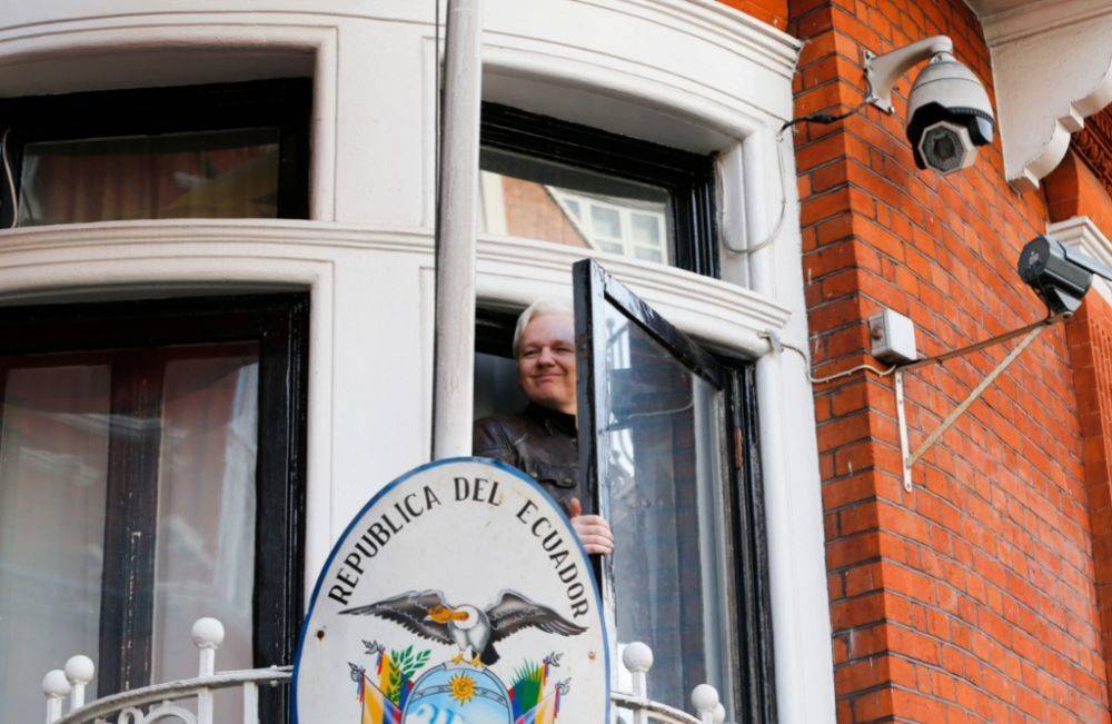 2017年5月19日,在英国伦敦的厄瓜多尔驻英使馆,“维基揭秘”创始人朱利安·阿桑奇在阳台上露面。新华社记者 韩岩 摄