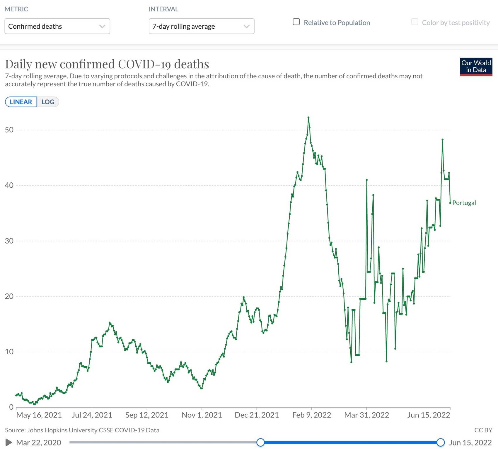 目前,BA.4、BA.5已经成为葡萄牙的主导变异株,虽然葡萄牙的疫苗接种率超过85%,且在2021年底到2022年初刚刚经历过奥密克戎BA.1、BA.2的大量感染,葡萄牙仍旧出现了新的一波感染浪潮,且阳性检出率一度高达50.63%。新增死亡数也重新回到2022年1月-2月奥密克戎感染高峰时的水平。