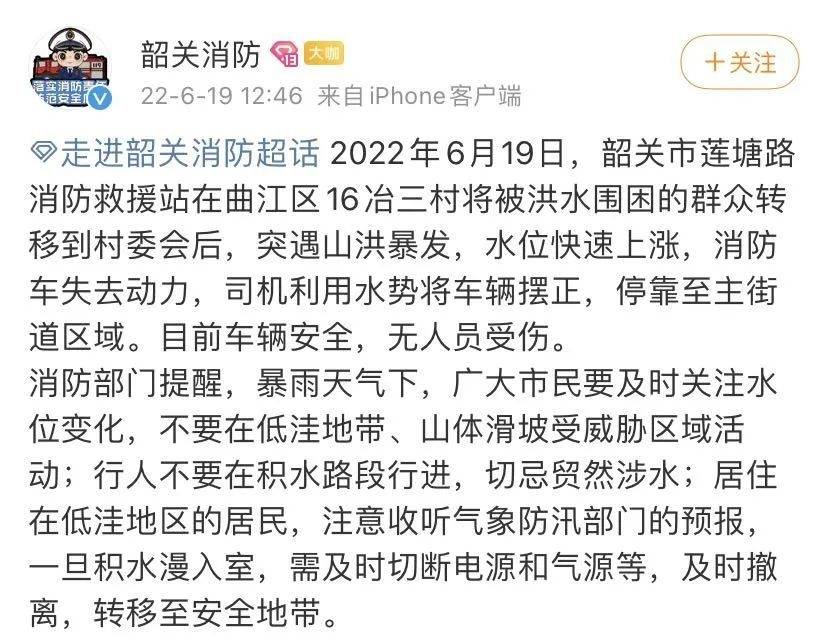 据韶关消防消息,莲塘路消防救援站在曲江区16冶三村将被洪水围困的群众转移到村委会后,突遇山洪暴发,水位快速上涨,消防车失去动力,司机利用水势将车辆摆正,停靠至主街道区域。目前车辆安全,无人员受伤。