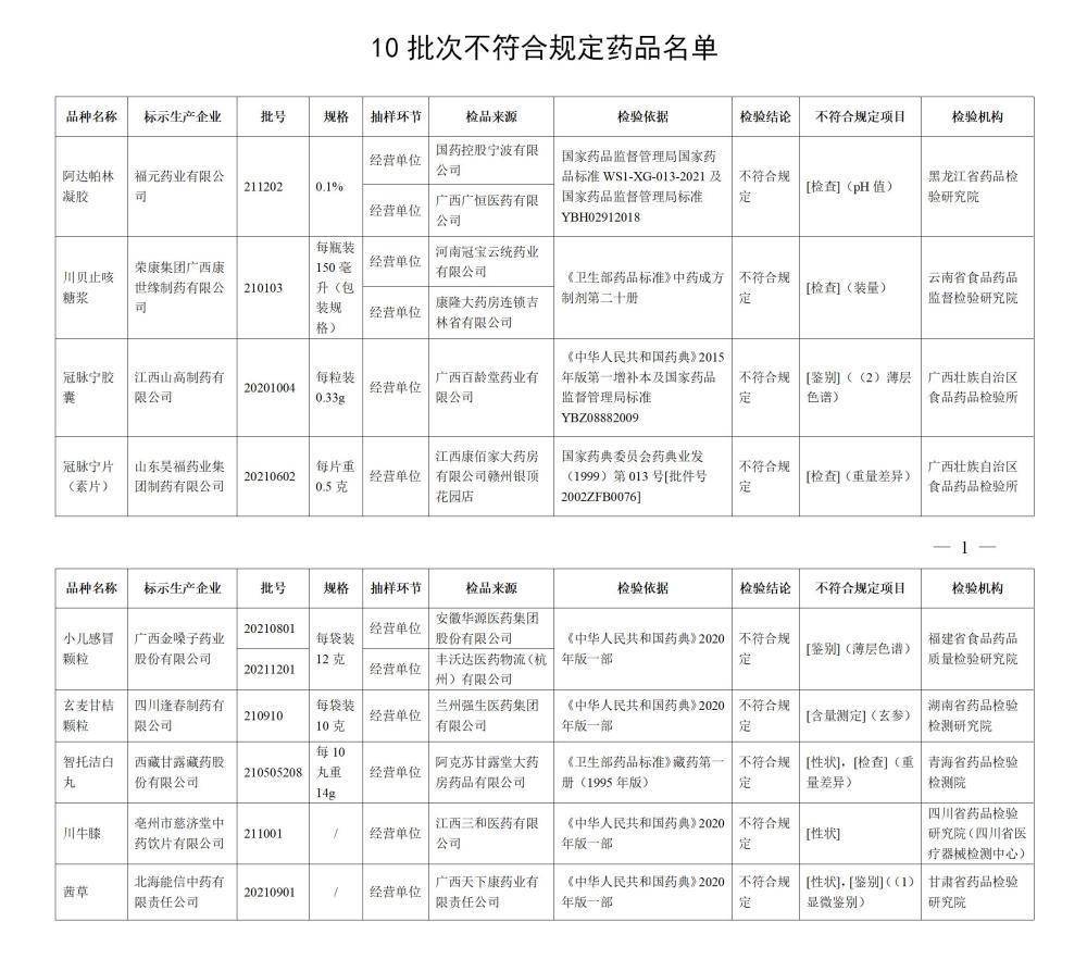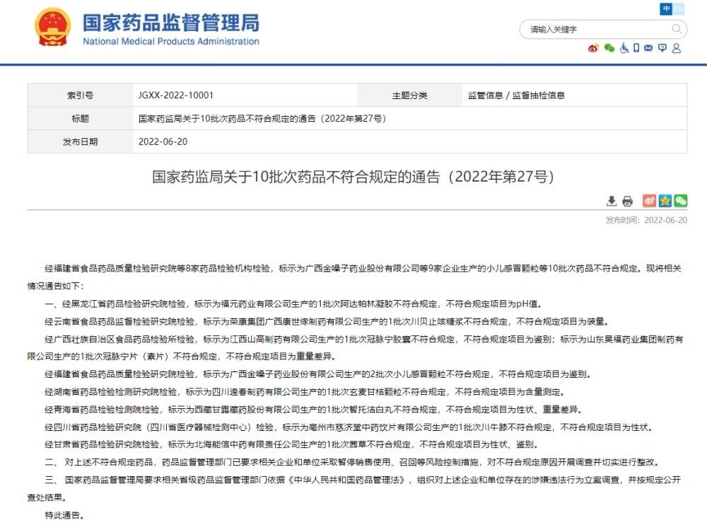 原标题:国家药监局关于10批次药品不符合规定的通告(2022年第27号)