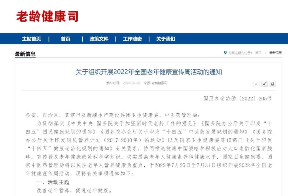 为协同推进健康中国战略和积极应对人口老龄化国家战略,切实提高老年人健康素养和健康水平,国家卫生健康委、国家中医药管理局日前联合印发通知,将以关注老年人营养健康为重点,于2022年7月25日至7月31日组织开展2022年全国老年健康宣传周活动。