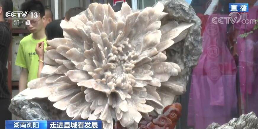 浏阳是一个矿产资源丰富的地方,其中有一种在全世界独一无二的矿石。我们看这块原石,这种石头上有约两亿年前结晶盐的痕迹,呈菊花状从中心往四周辐射,因此它被称为“菊花石”。在浏阳,上百年来一直有心灵手巧的当地匠人将这种矿石加工成艺术品。如今,当地创意工坊和文创企业把菊花石制作出各种实用的小玩意儿,让它走进更多的寻常百姓家。