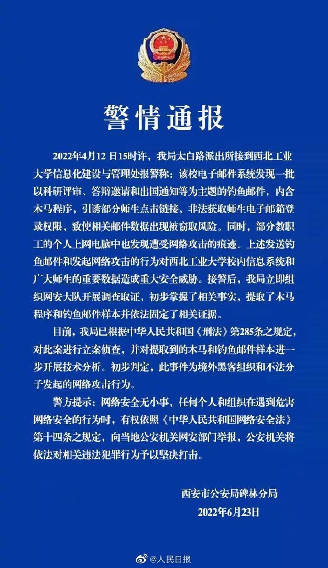 据@西安碑林公安 :2022年4月12日15时许,我局太白路派出所接到西北工业大学信息化建设与管理处报警称:该校电子邮件系统发现一批以科研评审,答辩邀请和出国通知等为主题的钓鱼邮件,内含木马程序,引诱部分师生点击链接,非法获取师生电子邮箱登录权限,致使相关邮件数据出现被窃取风险。同时,部分教职工的个人上网电脑中也发现遭受网络攻击的痕迹。上述发送钓鱼邮件和发起网络攻击的行为对西北工业大学校内信息系统和广大师生的重要数据造成重大安全威胁。接警后,我局立即组织网安大队开展调查取证,初步掌握了相关事实,提取了木马程序和钓鱼邮件样本并依法固定了相关证据。目前,我局已根据中华人民共和国《刑法》第285条之规定对此案进行立案侦查,并对提取到的木马和钓鱼邮件样本进一步开展技术分析。初步判定,此事件为境外黑客组织和不法分子发起的网络攻击行为。